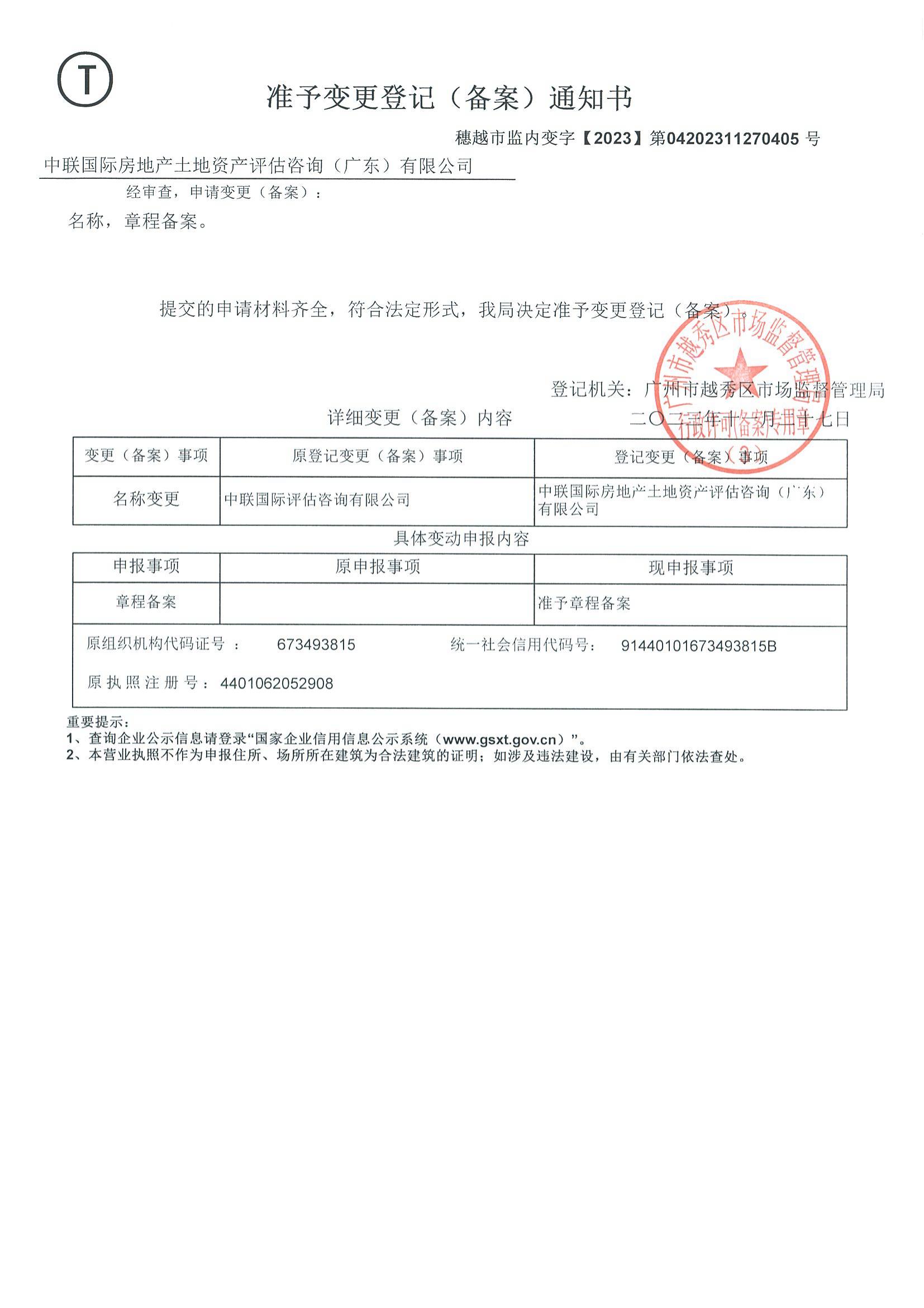 為整合多種評估資源,完善房地產(chǎn)估價(jià)資質(zhì),更加全方位、專業(yè)、細(xì)致地提供資產(chǎn)評估服務(wù),按照《企業(yè)名稱登記管理規(guī)定實(shí)施辦法》(2023年8月29日國家市場監(jiān)督管理總局令第82號公布,自2023年10月1日起施行),中聯(lián)國際評估咨詢有限公司于2023年12月10日正式更名為“中聯(lián)國際房地產(chǎn)土地資產(chǎn)評估咨詢(廣東)有限公司”。